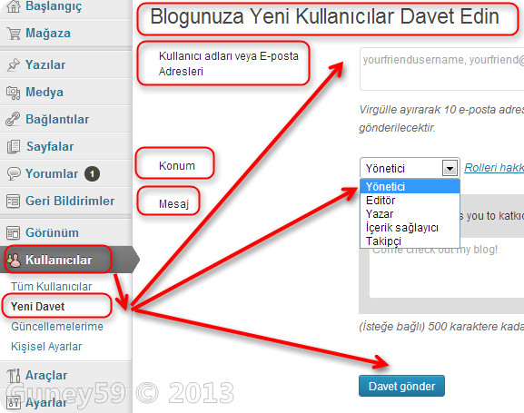 Uyarı: Blogunuza yeni bir yönetici kullanıcı eklerken çok dikkatli olun. Tüm yetkilere sahiptir. Güvenmediğiniz kişileri atama yapmayın.