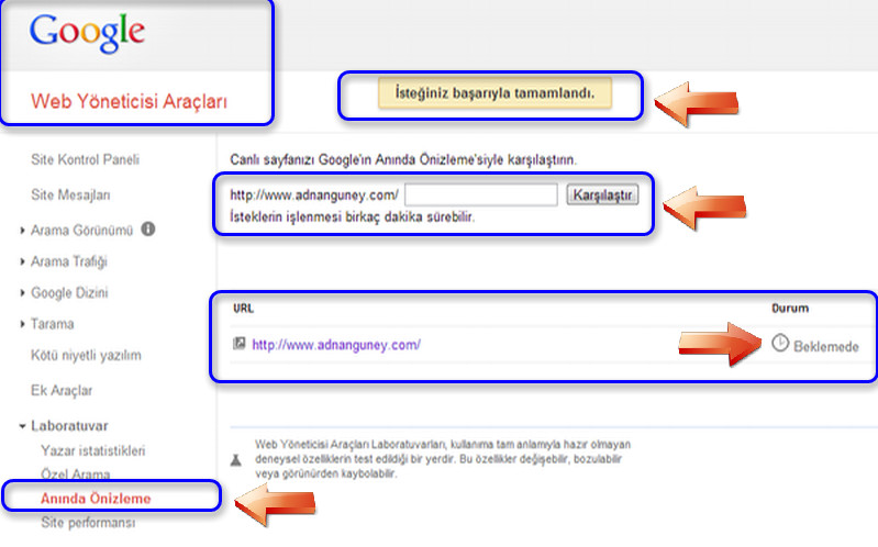Web Yönetici Araçlarında site sayfalarınızı anında önizleme ile karşılaştırarak çalışmalarınızı kontrol edebilirsiniz. Blog/Site sahibi iseniz Google Web Yönetici Araçlarına mutlaka kaydınız vardır. Google Web Yönetici Araçlarına bu güne kadar kayıt yapmadı iseniz Blog/Sitenizin kaydını hemen yapmanızı tavsiye ederim.Google Web Yönetici Araçları Blog/Site bilgilerinizi